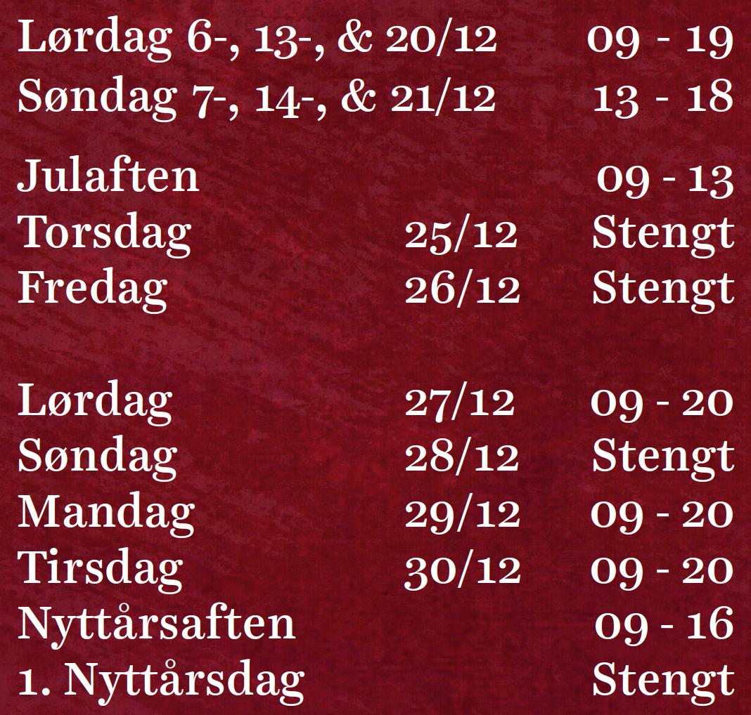 Se hver enkelt butikk for avvikende åpningstider i julen. Våre åpningstider i julen vil variere fra butikk til butikk, klikk deg helt inn på butikken du ønsker å besøke for avvikende åpningstider. God høytid til alle våre kunder, og velkommen innom for deilig Julekaffe og andre juleprodukter.