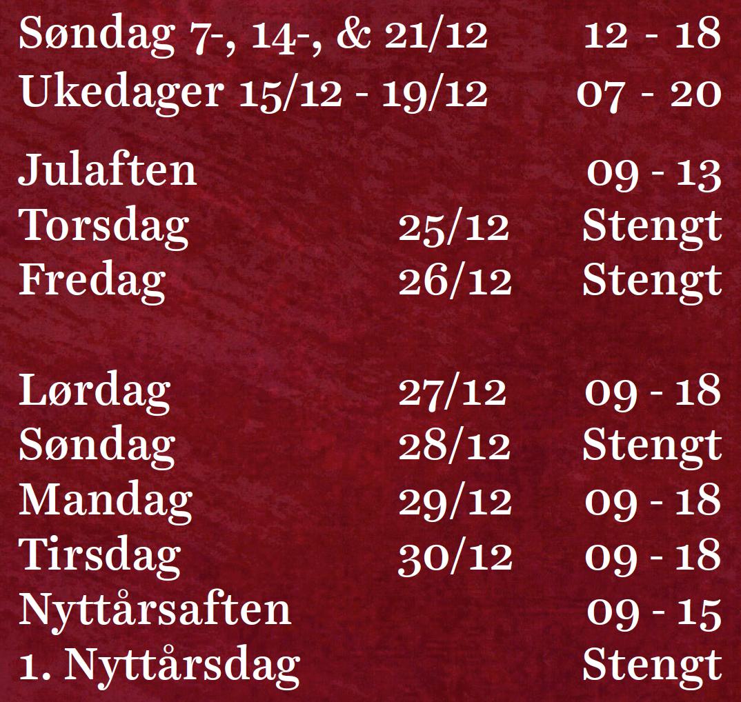 Se hver enkelt butikk for avvikende åpningstider i julen. Våre åpningstider i julen vil variere fra butikk til butikk, klikk deg helt inn på butikken du ønsker å besøke for avvikende åpningstider. God høytid til alle våre kunder, og velkommen innom for deilig Julekaffe og andre juleprodukter.