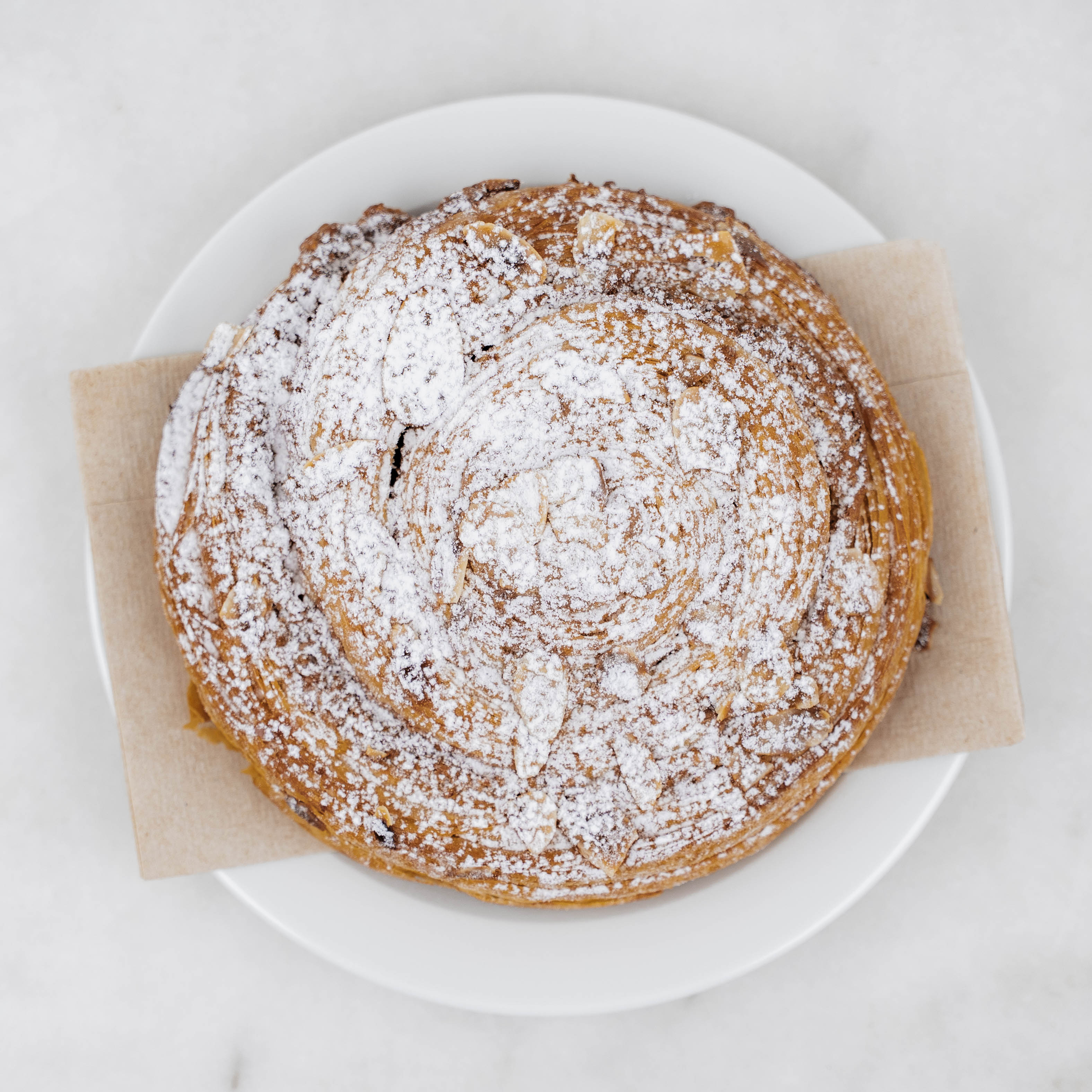 En herlig snurr laget med samme butterdeig vi bruker i vår Croissant. Fylt med mandelkrem, skivede mandler, melis, sukker og smør i en deilig kombinasjon.